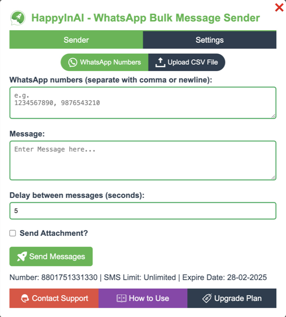 HappyInAI WhatsApp Bulk Message Sender is a tool that allows you to send bulk WhatsApp messages efficiently. You can import contacts using CSV files or manually enter multiple numbers, making it perfect for businesses, marketers, and personal outreach.
